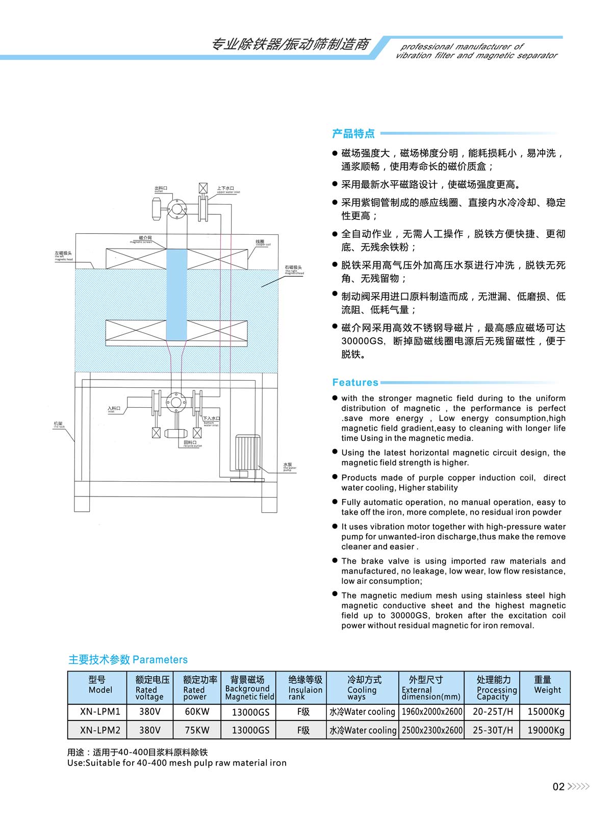 ·High gradient magnetic field, except for iron effect ·Using the latest horizontal magnetic circuit design, the magnetic field strength is higher. Products made of purple copper induction coil,direct water cooling, Higher stability ·Fully automatic operation, no manual operation, easy to take off the iron, more complete, no residual iron powder It uses vibration motor together with hing-pressure wate pump for unwanted-iron discharge,thus make the remove cleaner and easier . ·The brake valve is using imported raw materials and manufactured, no leakage, low wear, low flow resistance, low air consumption; ·The magnetic medium mesh using stainless steel high magnetic conductive sheet and the highest magnetic field up to 30000GS, broken after the excitation coil power without residual magnetic for iron removal. ; |